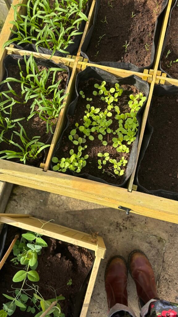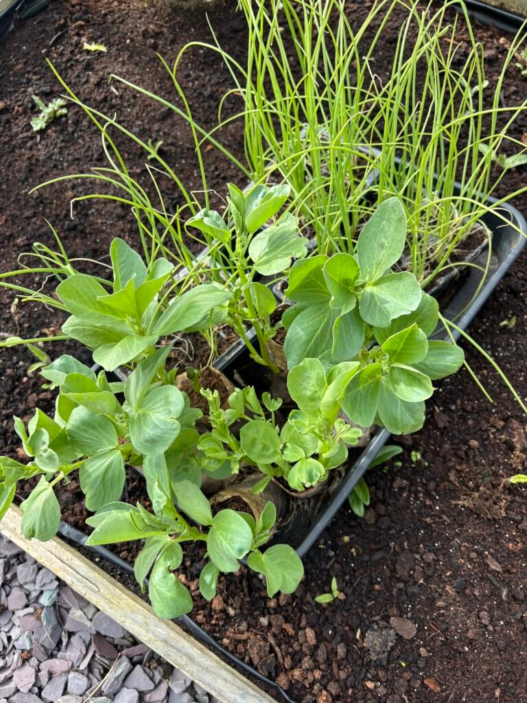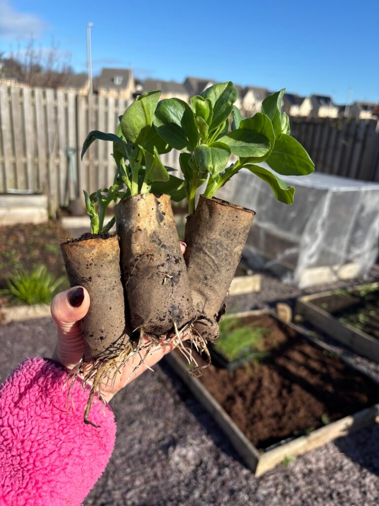 The toilet roll tubes for the broad beans have been great. They’re still holding up but I can tell that they will break down quickly once they’re in the ground. We do have plastic root trainers but they’re a bit of a faff and always seem to topple over so I’m enjoying the simplicity of the tubes.