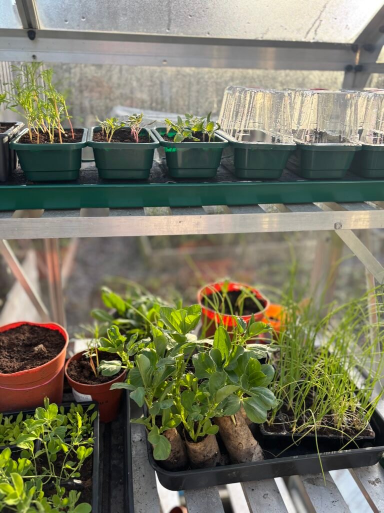 Although the garden is still quite empty, perennials are popping up and the greenhouse is looking lush! Storm Dave has put a stop to some of my planting out plans this weekend – I think the onions and broads beans are itching to get their roots in the soil but at least it’s giving me the chance to harden them off properly. If they can survive Dave blowing them about the place for a few hours a day, I’m sure they’ll cope next week when it’s due to warm up.