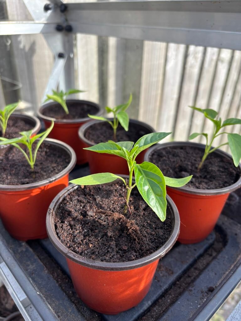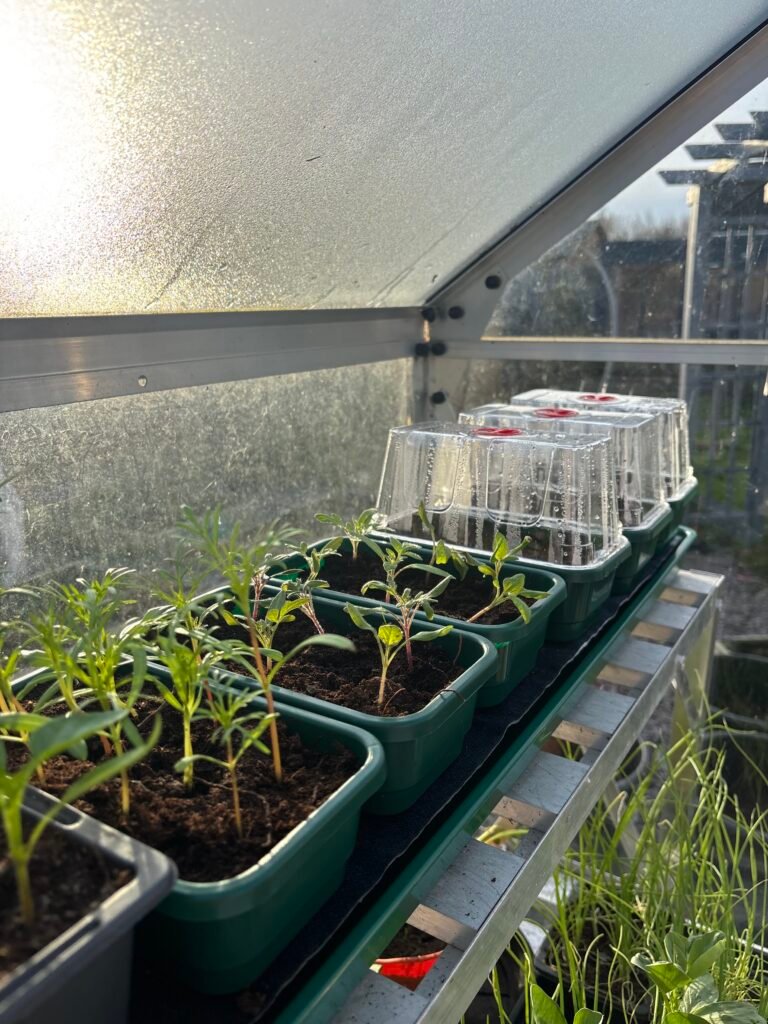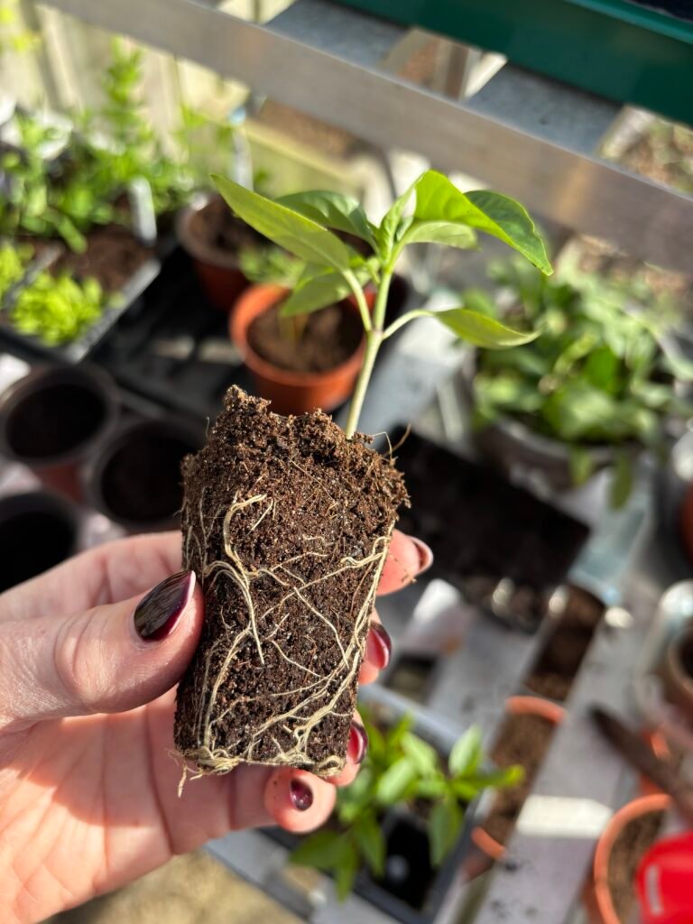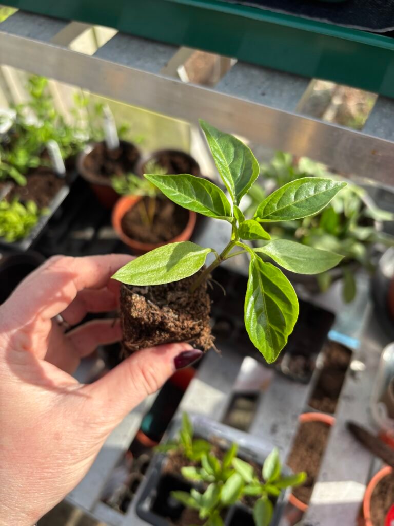 It’s sunny but cold so I’ve spent more time in the greenhouse this weekend potting on and sowing more seeds. The peppers seem to be doing well with the cosy house at night and the sunshine in the greenhouse all day. Now that they have more space to grow, it’ll be fun watching them thrive over the next couple of months. I’ll likely top them in May – this is where you prune them in a way that encourages bushier growth rather than one single stem, making them more able to cope with the weight of the fruit they’ll bear in the summer months.